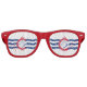 Sunglasses with flag of city of Cincinnati, Ohio; white flag with three blue waves with red “C” in the centre
