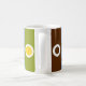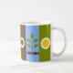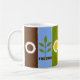 Mug with flag of Fresno, California, flag with three vertical bands of brown, blue and green, with stylized illustrations of cog, plant and sun