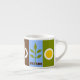 Espresso Mug with flag of Fresno, California; flag with three vertical bands of brown, blue and green, with stylised illustrations of cog, plant and sun