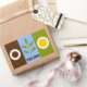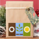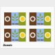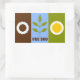Sticker with flag of Fresno, California; flag with three vertical bands of brown, blue and green, with stylised illustrations of cog, plant and sun