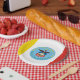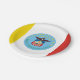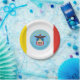 Paper Plate with flag of city of Columbus, Ohio; flag with three vertical bands of yellow, white and red with blue seal of the city with bald eagle in the centre