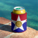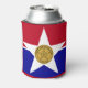 Can cooler with flag of city of Dallas, Texas; flag with red and blue horizontal bands with seal of the city inside of a white star in the centre