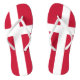 Flag of Denmark: "Guds hjæ lp, Folkets kæ rlighed, Danmarks styrke" → "The help of God, the love of the people, the strength of Denmark". It is composed of a white Scandinavian cross on a beautiful red background.