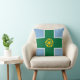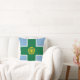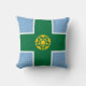 Throw pillow with design with a flag of historic county of Derbyshire, in England, Great Britain; blue flag with a green cross and a gold Tudor rose in the centre