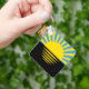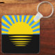 Square keychain with the flag of Donetsk Oblast (Donetska oblast, Доне́цька о́бласть), a blue, yellow, and black flag with a rising gold sun and 12 sunbeams