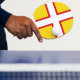Ping Pong Paddle with design with a flag of historic county of Dorset, in England, Great Britain; yellow flag with a white cross with a red border