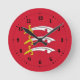 Wall Clock with design with a flag of historic county of Essex, in England, Great Britain; red flag with three white, gold hilted Saxon swords (Seaxes)