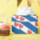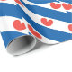 Flag of Friesland, a province in The Netherlands. It consists of blue and white diagonal stripes; in the white stripes are red pompeblêden, leaves of the yellow water-lily, that may remind one of hearts, but according to the official instructions "should not be heart-shaped".