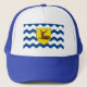 Hat with design with a flag of historic county of Hertfordshire, in England, Great Britain; flag with an illustration of a stag in a yellow shield on white and blue wavy background