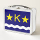 Metal Lunchbox with design with flag of Kinshasa, capital city of Democratic Republic of Congo, blue flag with white wave, two golden stars and letter ‘K’ in the centre
