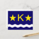 Postcard with design with flag of Kinshasa, capital city of Democratic Republic of Congo, blue flag with white wave, two golden stars and letter ‘K’ in the centre