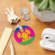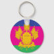 Button Keychain with flag of Krasnodar Krai, flag with tricolor of blue, purple and green, with golden coat of arms in the center