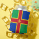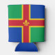 Can cooler with design with a flag of historic county of Lincolnshire, in England, Great Britain; green and blue flag with red and yellow cross and a Fleur-de-Lis in the centre