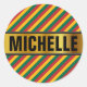 This round sticker design features a pattern of stripes (lines) coloured yellow, green and red. These colours were inspired by those of the national flag of Lithuania. This could be a great gift for somebody from Lithuania, or perhaps for somebody who just really likes the country of Lithuania or Lithuanian culture. It also features a personalised name within a faux gold coloured area.