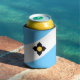 Can cooler with flag of city of Madison, Wisconsin; light blue and white flag with a black cross and yellow circle in the centre