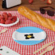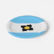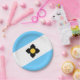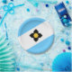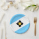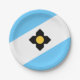 Paper plate with flag of city of Madison, Wisconsin; light blue and white flag with a black cross and yellow circle in the centre