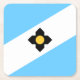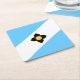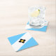 Paper coaster with flag of city of Madison, Wisconsin; light blue and white flag with a black cross and yellow circle in the centre