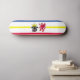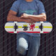 Skateboard with variant flag of Mecklenburg-Western Pomerania; design with five horizontal stripes of red, white, blue and yellow, and with illustrations of bull’s head and red eagle