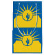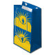 Paper bag with flag of city Mesa, Arizona; yellow and blue flag with stylised illustrations of desert, cactus and rising sun