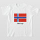The flag of Norway is red with an indigo blue Scandinavian cross outlined in white that extends to the edges of the flag; the vertical part of the cross is shifted to the hoist side in the style of the Dannebrog, the flag of Denmark.