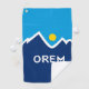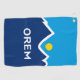 Golf Towel with a design with the flag of Orem, Utah. A blue, white, and yellow flag with mountain peaks and the sun in the centre