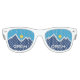 Sunglasses with a design with the flag of Orem, Utah. A blue, white, and yellow flag with mountain peaks and the sun in the centre