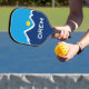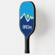 Pickleball Paddle with a design with the flag of Orem, Utah. A blue, white, and yellow flag with mountain peaks and the sun in the centre