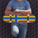 Skateboard with design with a flag of historic county of Orkney, in Scotland, Great Britain; red flag with blue and yellow Nordic cross