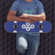 Skateboard with a design with the flag of Osaka Prefecture in Japan (大阪府, Ōsaka-fu), a blue flag with a white symbol