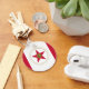 Button Keychain with flag of city of Raleigh, North Carolina; flag with three vertical bands of red and white with city’s seal in the centre