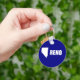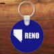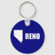 Button Keychain with flag of city of Reno, Nevada; blue flag with white shape of Nevada with star symbolising Reno’s location inside the state