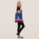 Tote bag with flag of city of Richmond, Virginia; blue flag with red and white stripes, with white stripes and silhouette of man working James river bateau down the James river
