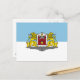 Postcard with design with flag of Riga, capital city of Latvia; white and blue flag with coats of arms with two golden lions holding a shield in the centre