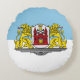 Round Pillow with design with flag of Riga, capital city of Latvia; white and blue flag with coats of arms with two golden lions holding a shield in the centre