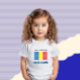 Isolated pixelated flag of Romania with text: Blue. Yellow. Red. Forever Romanian