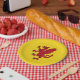 Paper plate with design with a flag of historic county of Somerset, in England, Great Britain; yellow flag with an illustration of a red dragon in the centre