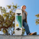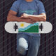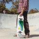 Skateboard with a design with the flag of Spokane, Washington. A white and green flag with blue lines symbolizing the Spokane river and Spokane Falls and a yellow sun