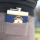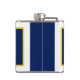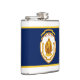 Flask with the flag of Springfield, Massachusetts. A blue flag with a yellow and white outline and the illustration of the statue of Augustus Saint Gaudens in the centre