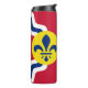 Tumbler with flag of city of St. Louis; red flag with white and blue waves and blue fleur-de-lys in yellow circle