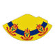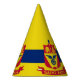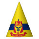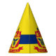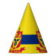 Party Hat with flag of city of St Paul, Minnesota; flag with three horizontal stripes of blue and yellow with red emblem in the centre