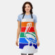 Apron with a design with the flag of St. Petersburg, Florida. A flag with orange, red, green, blue, and navy blue stripes with a symbol of white pelican