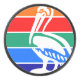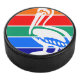 Hockey Puck with a design with the flag of St. Petersburg, Florida. A flag with orange, red, green, blue, and navy blue stripes with a symbol of white pelican