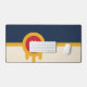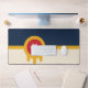 Desk Mat with a design with the flag of Tulsa, Oklahoma. A beige and navy blue flag with a gold Osage shield containing a red circle and a beige six-pointed star