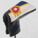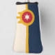 Golf Head Cover with a design with the flag of Tulsa, Oklahoma. A beige and navy blue flag with a gold Osage shield containing a red circle and a beige six-pointed star