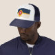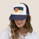 Trucker Hat with a design with the flag of Tulsa, Oklahoma. A beige and navy blue flag with a gold Osage shield containing a red circle and a beige six-pointed star