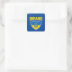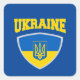 The national flag of the Ukraine with the coat of arms placed onto it, are infused into a shield shape with the country name added above.