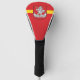 Golf driver cover with design with flag of Vilnius, capital city of Lithuania; red flag with yellow stripe and coats of arms with two golden lions holding a shield in the centre