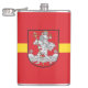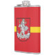 Flask with design with flag of Vilnius, capital city of Lithuania; red flag with yellow stripe and coats of arms with two golden lions holding a shield in the centre