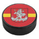 Hockey puck with design with flag of Vilnius, capital city of Lithuania; red flag with yellow stripe and coats of arms with two golden lions holding a shield in the centre