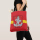 Tote bag with design with design with flag of Vilnius, capital city of Lithuania; red flag with yellow stripe and coats of arms with two golden lions holding a shield in the centre